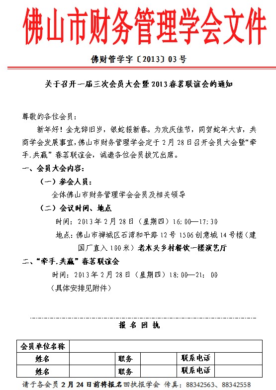 关于召开一届三次会员大会暨2013春茗联谊会的通知